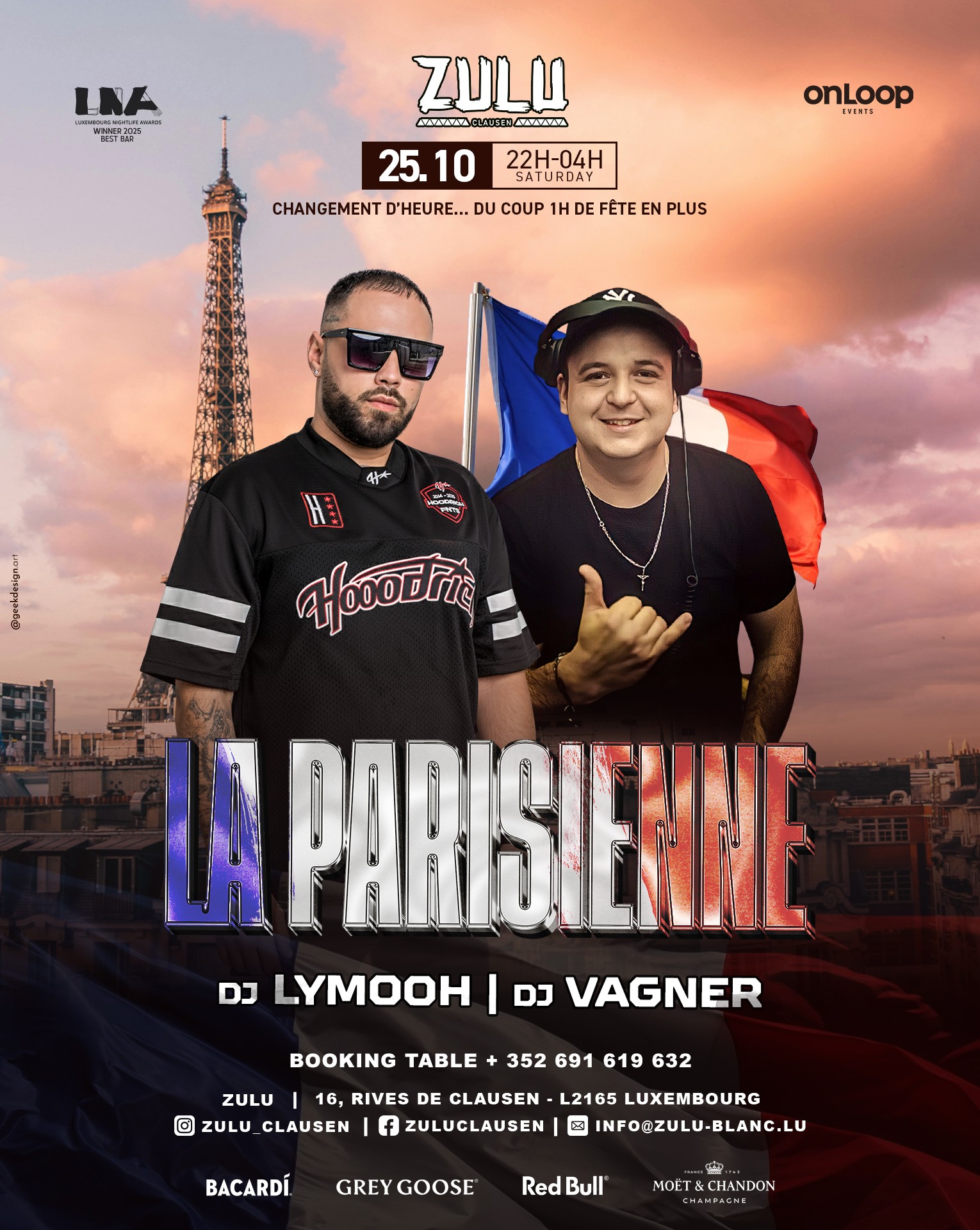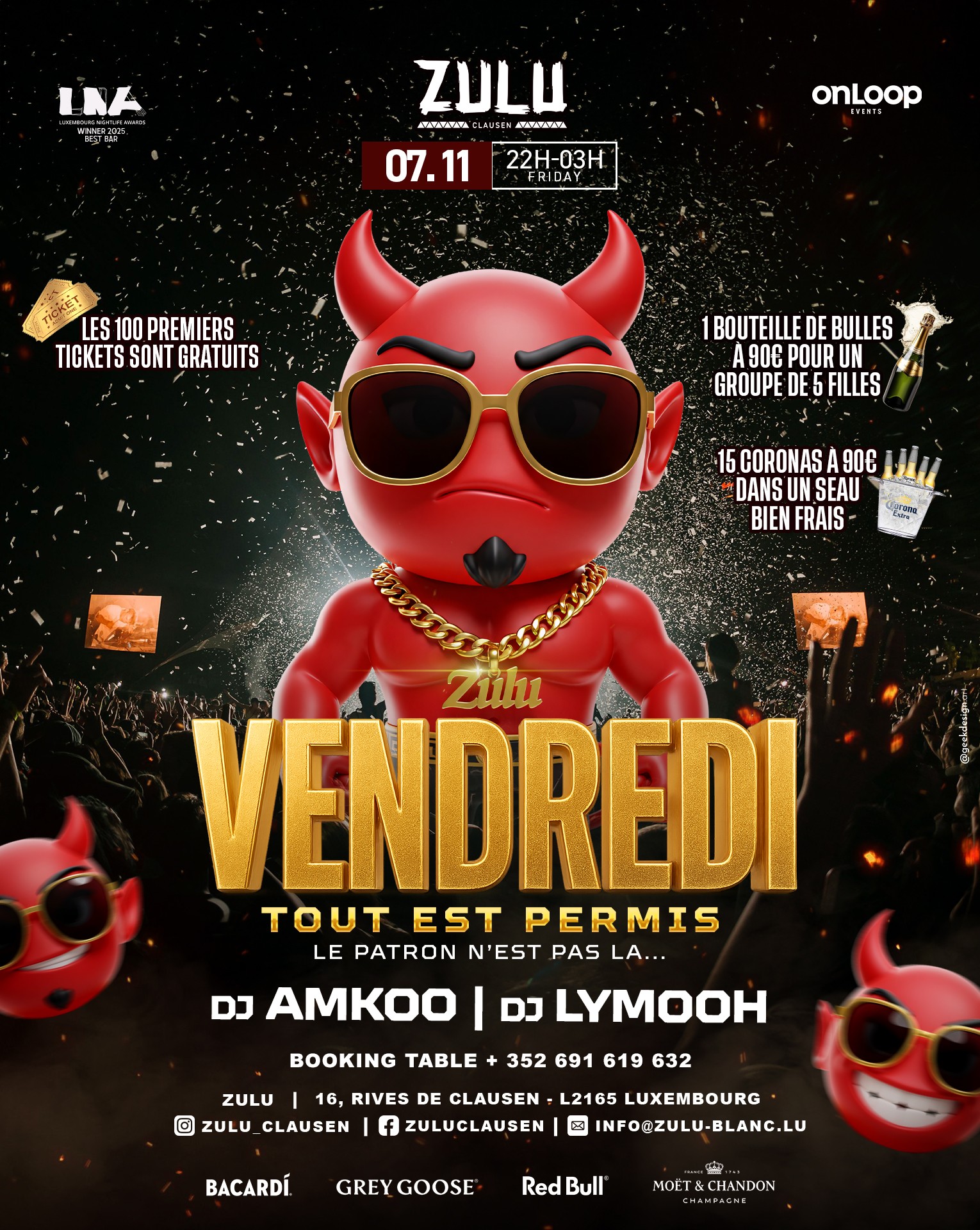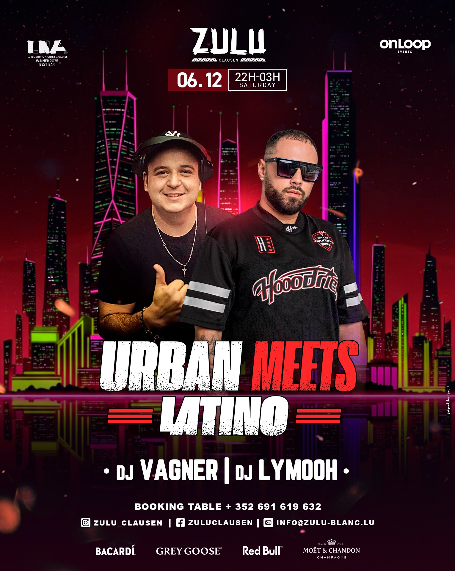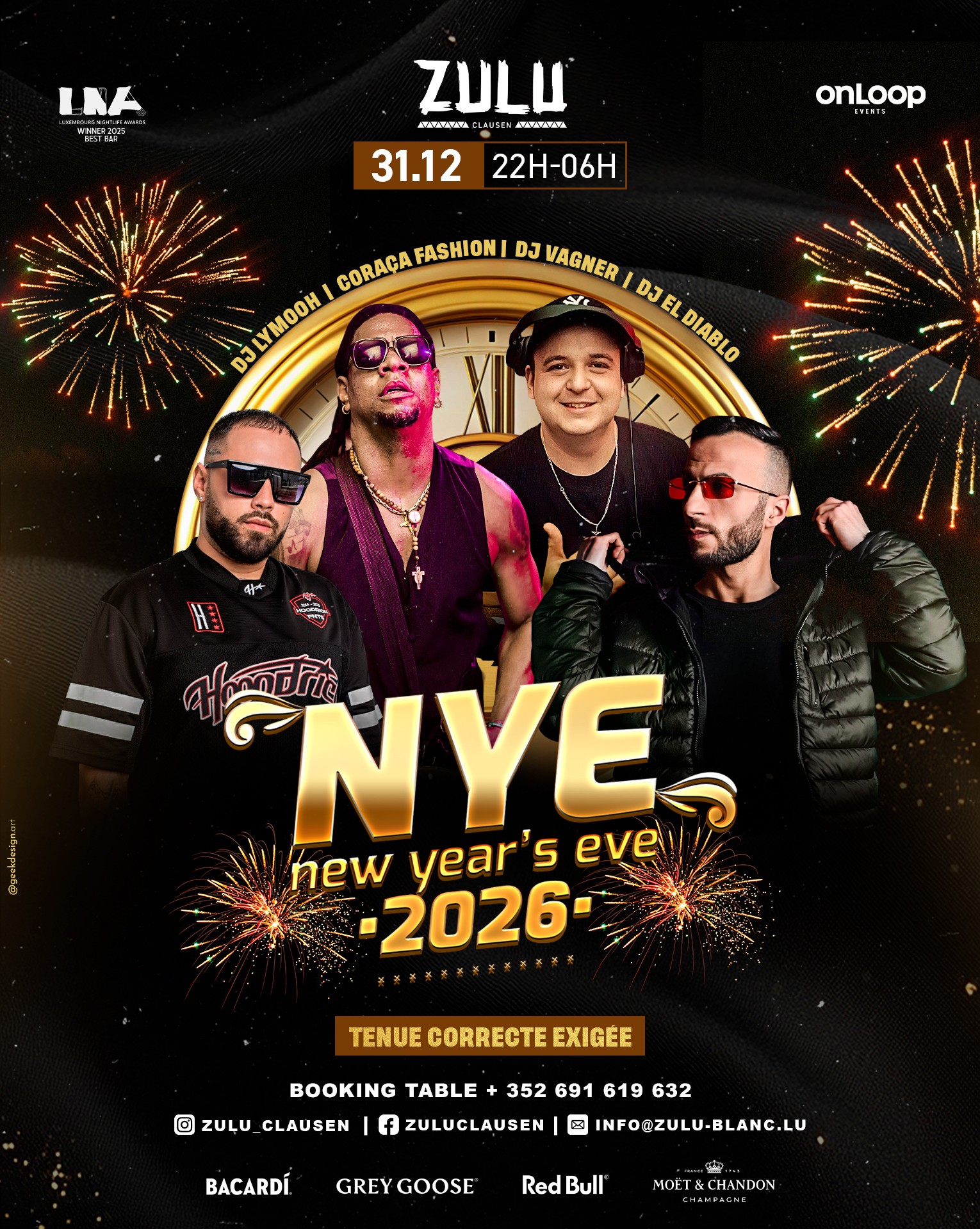 EVENTS OUVERTURE Jeudi18:00 - 01:00Vendredi et samedi18:00 - 03:00 CONTACT 16, Rives de Clausen L-2165 LUXEMBOURG +352 691 619 632 info@zulu-blanc.lu SUIVEZ-NOUS SuivreSuivre NEWSLETTER JOBS NEWS MENTIONS LÉGALES PHOTOS CREDITS Luis DINIS WEB DESIGN Marion STEHLY © ZULU CLAUSEN – 2025