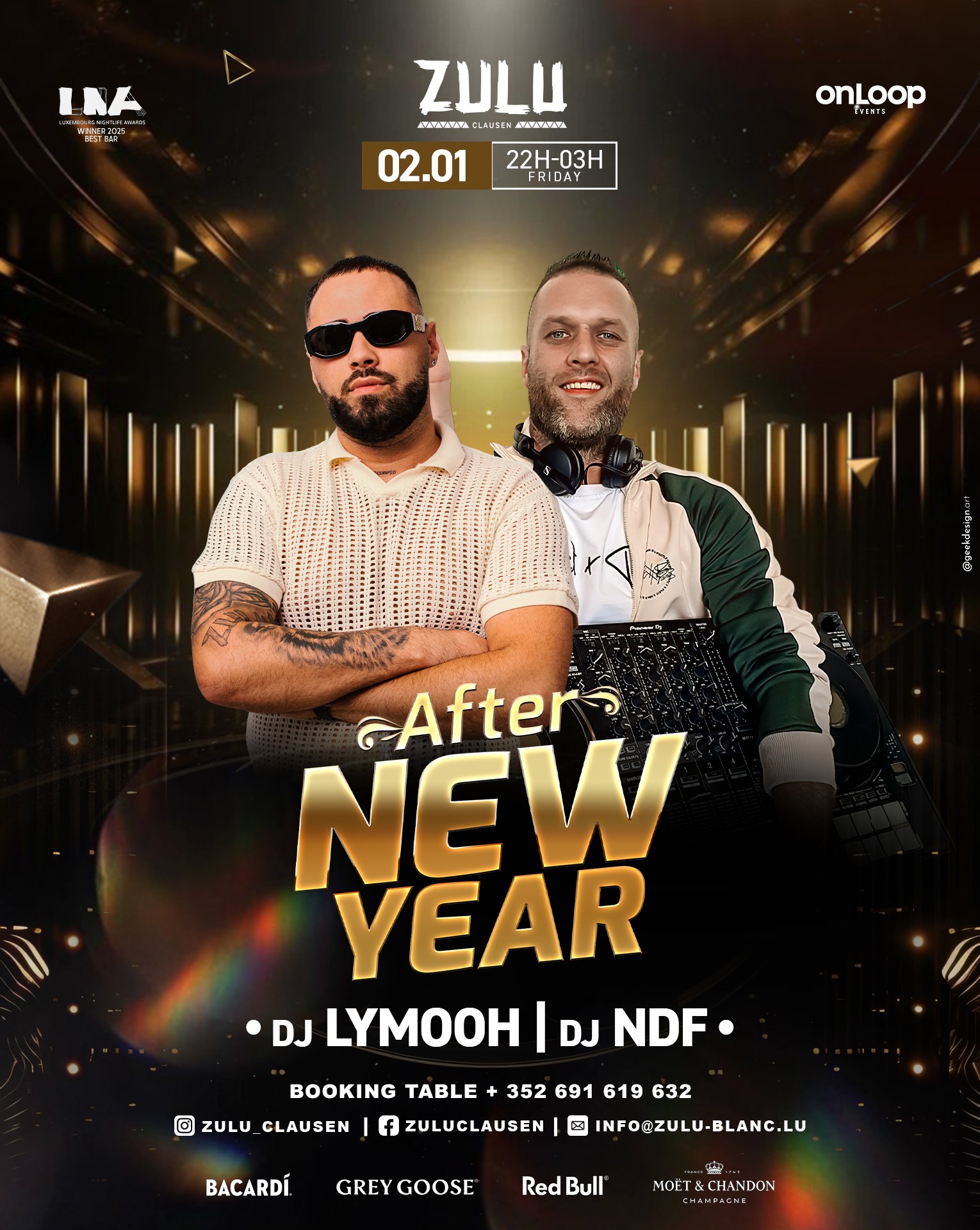 EVENTS OUVERTURE - Vendredi et samedi22:00 - 03:00 CONTACT 16, Rives de Clausen L-2165 LUXEMBOURG +352 691 619 632 info@zulu-blanc.lu SUIVEZ-NOUS SuivreSuivre NEWSLETTER JOBS NEWS MENTIONS LÉGALES PHOTOS CREDITS Luis DINIS WEB DESIGN Marion STEHLY © ZULU CLAUSEN – 2025